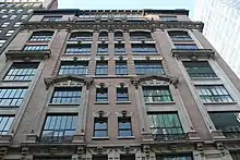 The fourth through eighth stories are clad with pink brick and have terracotta and stone ornamentation.[19] On the 40th Street elevation, most windows are full-height; the center bay has two narrow windows, while the remaining bays have a large studio window. All bays, except the center one, have a balcony at the fourth story. The outermost bays are flanked by continuous brick piers from the fourth to eighth stories, with a volute above the sixth story and a balcony at the seventh.[16] The three middle bays are arranged differently. At the fourth and fifth stories, the center bay's windows are topped by volutes, and the second-outermost bays have double-height stone frames topped by pediments. At the sixth through eighth stories, the three middle bays have full-height recessed windows, each with volutes and splayed lintels above them. A window sill connects the three middle bays at the sixth story.[22] On the eighth story, all openings contain segmental arches.[21]