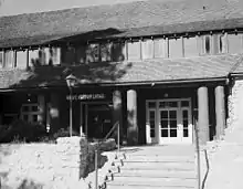 The two-story lodge is built on a stone base with intentionally oversized log framing, creating a massive, rustic appearance. The central portion of the building dates to 1924, with the addition of the north and southeast wings taking place in 1926. The lodge is entered by a long porch fronting the entire lobby, whose roof rests on a 52-foot (16 m) long log beam supported by paired log columns. The lodge is capped by a heavy, steeply-pitched shingled roof with clipped gables and shed dormers.[2][3][4]