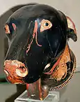 The Brygos Painter seems to be one of the earliest red-figure artists who were not in direct contact with the so-called Pioneers.[5] His teacher appears to have been Onesimos, as his style is derived from the earlier work of that master, and their periods of production run parallel.[6] Typical subjects are symposium and palaistra scenes, and his figures are characterized by their flat-topped heads, long noses, and narrow eyes with high, arching eyebrows. While his drawing is not always of the utmost precision, the postures of his figures and the expressiveness of their faces are remarkable. He is also one of the first, and very few, painters who managed to paint a child to look truly like a child, and not like a small adult. Many of his figures also clearly display the effects of age. Stubbly beards or stubbly hair (on old men), as well as signs of balding, are also typical. His skill in painting the human mouth is exceptional: his figures are shown whistling, singing, playing the flute or clenching their lips with a high degree of anatomical accuracy. All this indicates the Brygos Painter was a skilled observer of human emotion, expression, and interaction.
