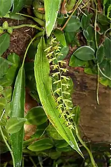 Bryobium queenslandicum, commonly known as the dingy urchin orchid,[2] is an epiphytic or lithophytic clump-forming orchid that has cylindrical, fleshy green pseudobulbs, each with two leaves and between three and twelve small, self-pollinating, cream-coloured or pinkish flowers. This orchid only occurs in tropical North Queensland.