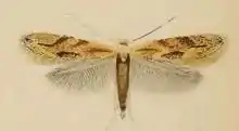 The wingspan is 7–9 mm.[2] The head is pale fuscous, mixed in middle with blackish. Forewings are brownish-whitish, irrorated with dark fuscous; a more or less distinct dark streak along fold from base to near middle, often incomplete; three oblique costal spots between 1/3 and apex, and a median dorsal spot suffusedly dark fuscous: second discal stigma forming a short blackish dash. Hindwings are grey. The larva is dull green, more yellowish above; dorsal line darker; dots yellowish and the head pale brown[3] Adults are on wing from mid-May to mid-August.[4] The larvae feed on Amelanchier, Chaenomeles, Cotoneaster, Crataegus douglasii, Crataegus laevigata, Crataegus monogyna, Cydonia oblonga, Malus domestica, Mespilus germanica, Prunus insititia, Prunus spinosa, Pyracantha coccinea, Pyrus communis, Sorbus aria, Sorbus aucuparia and Sorbus torminalis. They mine the leaves of their host plant. The mine has the form of a small, hook-like corridor, mostly in a vein axle. The frass is deposited in a thick central line. The larvae soon leave their mine and resumes feeding living freely on the leaf.[5] Larvae can be found from June to August. They are greenish yellow with a darker head. Pupation takes place in a white, ribbed cocoon on detritus.