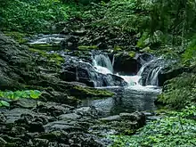 Here, after breaking through the rock formation of the Pfahl, the Wolfsteiner Ohe river carved up its way to 100 metres deep in the dark Pfahl slate rock of the Buchberger Nebenpfahl.[2] The protected area of Buchberger and Reschbachleite (officially: Schutz des Landschaftsteils Buchberger- und Reschbachleite, im Bereich der Gemeinden Freyung, Hohenau, Kumreut und Wasching, Landkreis Wolfstein) on 14 February 1961 has an area of 184 hectares. The white water gorge was designated in 2003 by the Bavarian Environment Ministry as one of the 100 mos beautiful geotopes in Bavaria. Further south its waters empty into the River Ilz.