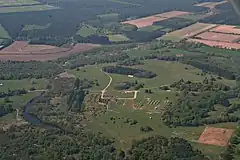 ![]() Aerial view (looking westwards) of the parkland of the former Buckenham Tofts House. The mansion house, re-built in 1803 and demolished in 1946, stood to the immediate left (south) of the landscaped serpentine lake formed by damming a tributary of the River Wissey. Army training buildings are visible, including a mock-up of an Afghan village | |