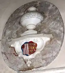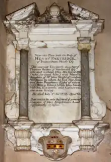 Henry III Partridge (1671–1733) of the parish of St. Andrew, Holborn, City of London, was the second son of Henry II and heir to his brother Robert Partridge (d.1710)[42] of Buckenham Tofts and Lowbrooke. He married, firstly, in 1701 to 15-year-old[47] Elizabeth Holder (d.1703), only daughter and sole heiress of Thomas Holder of Northwold in Norfolk (about 7 miles north-west of Buckenham Tofts) (by his wife Bridget Graves, a daughter of the antiquary Richard Graves (1677–1729),[48] of Mickleton, Gloucestershire[49]) who died 2 years later aged 17, by whom he had no issue, but from whom he managed nevertheless to inherit Northwold. Secondly, he married Martha Wright (d.1760), eldest daughter of John Wright, merchant.[42] Henry III's mural monument survives in St Mary's Church, West Tofts, as does one to his fifth daughter Elizabeth Partridge (1721–1754), wife of Rev. Samuel Knight, who bore the arms Argent, three pales gules in a bordure engrailed azure on a canton gules a spur or, of the family founded by the wealthy ironmaster Richard Knight (1659–1745) of Downton Hall, Herefordshire.[50]