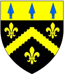 - Frances Spring, who married Edmund Wright (d.1583) of Sutton Hall in the parish of Burnt Bradfield[12] in Suffolk, a Member of Parliament for Steyning in Sussex in 1559 (a seat controlled by the Duke of Norfolk)[13] who became seated at Buckenham Tofts,[14] his father-in-law's manor. He was the second son and eventual heir of Robert (or Edmund) Wright of Sutton by his wife Jane Russell, a niece of John Russell, 1st Earl of Bedford (1485–1555).[15] Sutton Hall had been inherited by Jane Russell from her mother Jane Jervace (or Gervas) (wife of Thomas Russell), daughter and heiress of John Jervace of Sutton. The arms of Wright were: Sable, a chevron engrailed between three fleurs-de-lys or on a chief of the last three spear heads azure.[15] Edmund Wright by his wife Frances Spring left daughters and co-heiresses, one of whom was Anne Wright, heiress of Sutton Hall and of Barrett's Hall in Whatfield, who married Sir John Heigham of Barrough Hall.[15] Edmund Wright sold the wardship of his nephew William Spring (1532/4–1599) to Margaret Donnington (Countess of Bath) (see below).