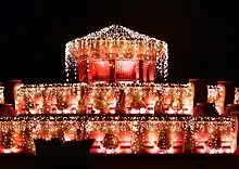 Buckingham Fountain is a Chicago Landmark in the center of Grant Park, between Queen's Landing and Ida B. Wells Drive. Dedicated in 1927 and donated to the city by philanthropist Kate S. Buckingham, it is one of the largest fountains in the world. Built in a rococo wedding cake style and inspired by the Latona Fountain at the Palace of Versailles, its design allegorically represents nearby Lake Michigan. The fountain operates generally from mid-April to mid-October, with regular water shows and evening colored-light shows. During the winter, the fountain is decorated with festival lights.