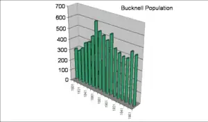 Despite more houses, the number of people living in Bucknell has dropped. The population of the village in 1811 Census was 226. At the end of the 19th century this had risen to 546. In the 1981 Census the population of the village was 494; in 1991 the population of the parish (probably including Bedstone) was 601 consisting of some 250 dwellings and in 2001 it was 642 in 294 dwellings.[8]