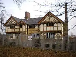 It is a timber-framed manor house on a high sandstone plinth with infilling partly in wattle and daub and partly in brick, and with a slate roof. It has an H-shaped plan, consisting of a hall with two cross-wings, and is in two storeys. Behind the hall is a projecting stair turret. The upper floors of the wings are jettied, and the gables have wavy bargeboards and apex finials. Inside are inglenooks, bressumers, and timber-framed partitions.[10][2]
