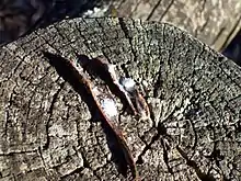 The pupae are creamy white without any apparent sclerotisation or colour pattern. The pupa is anchored inside of the last larval skin through the urogomphi. The larval exuvia, with the pupa inside, is attached underneath a piece of eucalypt bark. The entire body of the pupa is sparsely covered in a darker brown pubescence that is particularly longer and denser on pronotum. The body is segmented with eleven segments clearly visible: the three thoracic and eight abdominal segments. The body of pupa is broadly elongate with the pronotum flaring towards the mesonotum and the abdomen tapering to the terminal abdominal tergite. There are no spines anywhere on the body.
