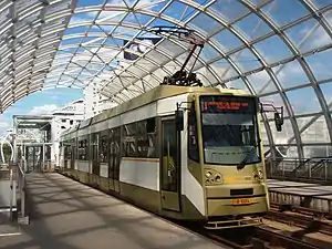 Bucur LF is a series of low-floor tram vehicles produced by the URAC section of the STB (formerly RATB) transit company of Bucharest, Romania.[1] The tram is configured as a three-section 65% low floor vehicle, with two powered and one unpowered bogies.[2] The vehicle has four double-leaf 1,305 mm (4.281 ft) wide doors, and at the outer ends there are two other single leaf 650 mm (2.13 ft) wide doors.[2]