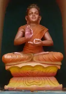 The Buddha was integrated into Vaishnavism through its mythology in the Vaishnava Puranas, where the Buddha is adopted as the ninth avatar of Vishnu.[10] According to the Agni Purana, Vishnu assumed this incarnation on earth due to the daityas defeating the devas in their battles. In order to restore the natural order, he deluded the asuras with his teachings. This caused them to abandon the path established by the Vedas and convert to Buddhism, causing them to be devoid of dharma. This caused them to become dasyus at the end of the Kali Yuga, causing them to be cast off to hell, devoid of good conduct.[11][12][13][14] Furthermore, it causes the age to be characterised by the intermixture of the varnas and domination by the Mlecchas, barbarian and foreign forces.[15] Subsequently, according to tradition, it became the responsibility of Adi Shankaracharya and future Vaishnava acharyas to re-establish theism.[16]