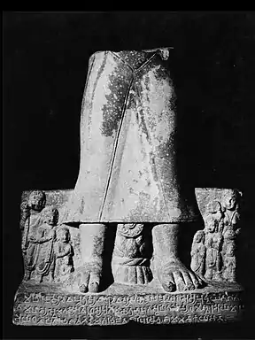 The relatively peaceful reign of Vasudeva is marked by an important artistic production, in particular in the area of statuary.[4] Several Buddhist statues are dated to the reign of Vasudeva, and are important markers for the chronology of Buddhist art.[5] A partially preserved Sakyamuni statue, also from Mathura, has the date "Year 94", although without mentioning Vasudeva specifically.[6]
