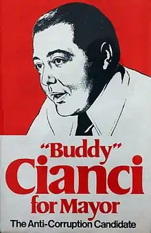 In the fall of 1974, Cianci narrowly beat incumbent Mayor Joseph A. Doorley Jr. on an anti-corruption campaign. Cianci was helped by a revolt of Democrats upset with Doorley's administration. Cianci presented himself as a visionary reformer, outlining plans to revive an economically troubled downtown, rebuild the waterfront, restore blighted neighborhoods, create parks, and improve schools.[8] Positioning himself as "the Anti-Corruption candidate," an Italian-American candidate taking on the Irish-American Democratic machine, Cianci won his first election by 709 votes.[9]