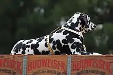 An obedience-trained Dalmatian dog also travels with each hitch, a Budweiser tradition since the 1950s. Historically, the role of the dogs was to guard the wagon and protect the team while the driver went inside buildings to make deliveries.[11] When the team performs today, the Dalmatians sit on the wagon, seated next to the driver.[8] The wagons are Studebaker wagons modified to carry water, originally manufactured c. 1900.[15]
