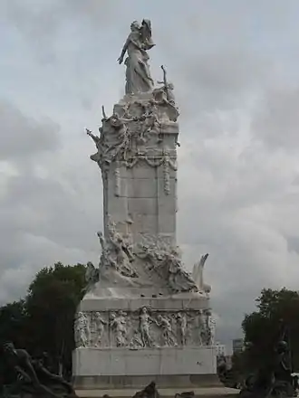 In March 1916, the ocean liner Príncipe de Asturias from Barcelona was wrecked 90 miles from Rio de Janeiro. In this accident, more than 450 people died and the load of marble ornaments and brass that composed the statuary of the monument was lost in the depths of the ocean. The following year, replicas were requested for those lost in the shipwreck. Finally, May 25, 1927 the count of Amalfi, on behalf of the king Alfonso XIII, made a symbolic delivery of the work to the president Marcelo Torcuato de Alvear.[1]