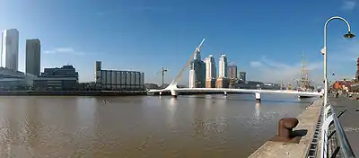 The Puente de la Mujer, in the Puerto Madero district, is a pedestrian bridge opened in 2001. It was designed by Valencian architect and engineer Santiago Calatrava. The bridge is 160 meters long and 6 meters wide, with a metallic mast that rises 39 meters. The bridge swings aside when a ship needs to pass through. The bridge was built in Spain and moved in parts to Buenos Aires in many shipments. Artistically, the author states that the work represent the figure of a couple dancing tango, where the white mast represents the man, and the curved silhouette of the bridge represents the woman.[13]