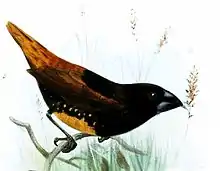 The buff-bellied mannikin (Lonchura melaena), also known as the sooty munia or Bismarck munia, is a species of estrildid finch found in New Britain and Buka Island. It has an estimated global extent of occurrence of 20,000 to 50,000 km2.