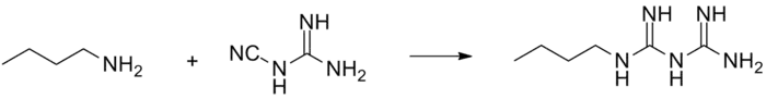 Buformin is obtained by reaction of butylamine and 2-cyanoguanidine.