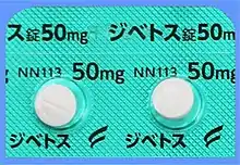 Two 50mg buformin (Dibetos) tablets in blister pack from Nichi-Iko Pharmaceutical (Japan).
