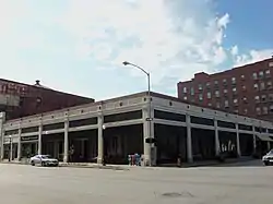 The building is a one-story structure on the corner of West Third and Main Streets that was designed to accommodate several businesses at the same time.[3] It has a steel structure that is covered in terra cotta. There are indications that the building was designed to be a multi-story structure with as many as ten floors.[6] The building is divided into five bays on the Third Street elevation and six on Main Street. Each elevation is dominated by large display windows. The steel structure, which was just becoming popular at the time, makes these large openings possible.[3] The pilasters mounted on stone pedestals topped with an egg and dart motif suggests the Classical. It becomes more stylized in the cornice, which is highlighted by terra cotta discs and diamonds. The bottom edge of the storefronts also features mosaic tiles.