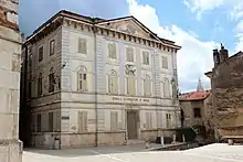 A Baroque style Church of Our Lady of Mercy from the 16th century, built on the foundations of an ancient Roman temple, dominates the central square.[4] The old city was protected with stone fortifications, part of which have been preserved to modern times. With its narrow streets and a central square, the old town is a fine example of Medieval architecture with strong Venetian Renaissance architecture influences, as in the rest of the region.
