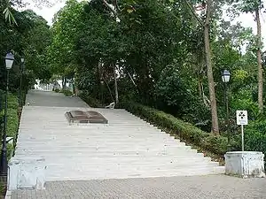 The two memorials on the hilltop were torn down when the Japanese surrendered and all that remains are two entrance pillars and the 120 steps that now lead to a transmission tower operated by Mediacorp.[5] Like Syonan Chureito, Syonan Jinja was destroyed too after the war to prevent it from being desecrated by the returning Allied forces. The ashes at the Japanese war memorial were subsequently re-interred in the Japanese Cemetery Park in Chuan Hoe Avenue.[1] Upon a suggestion to the authorities by a former Australian POW, S. Hannam, in 1981, the Singapore Tourist Promotion Board and National Heritage Board (NHB) erected a memorial plaque at the foot of the steps to commemorate this little known history and the sufferings of the Australian POWs during the Japanese Occupation of Singapore.[6] In 1995, the NHB gazetted the site as one of the 11 World War II sites in Singapore.[7]