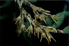 Bulbophyllum gadgarrense, commonly known as the tangled rope orchid,[2] is a species of epiphytic orchid with small pseudobulbs hidden beneath purplish brown bracts, dark green, grooved leaves and small white flowers with orange or yellow tips. It grows on rainforest trees in tropical North Queensland.