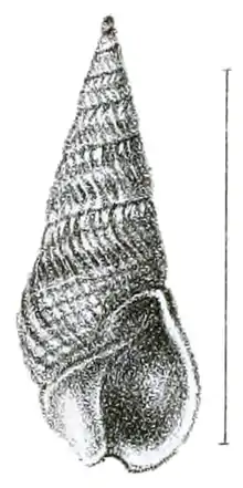 Shell elongate, acuminately spired, more or less livid in colour; whorls nine, the two apical ones smooth and shining, the rest but slightly convex, separated by an oblique suture, sculptured with oblique, somewhat flexuous, fine and close-set plicae, which extend from suture to suture in the upper whorls, and gradually become obsolete about the middle of the last volution; these riblets or plications, which are about equal in thickness to the spaces between them, give the upper margins of the whorls a finely crenulated appearance, and are subgranulous, through being intersected by spiral striae, which gradually become wider apart as the shell increases; they are about nine in number on the penultimate whorl; the last is encircled by about 13; and the keel which winds around its base is of a brown colour, and the portion of the whorl below it whitish; mouth ovate-acuminate above, occupying a little more than 3/8 of the entire length of the shell, olive-brown or purplish-brown margined with white within the labrum and at the base; labrum thickened, acute at the edge, and inconspicuously sinuated above; columella arcuate in the middle, thinly coated with a white enamel, which, extending above the lip and winding along the suture, gradually vanishes as it proceeds up the spire.