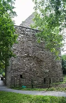 On the northern bank of the River Crana as it enters Lough Swilly sits the three-storey O'Doherty's Keep, which is the only surviving part of an original 14th-century Norman castle. The first two levels of the keep were built after 1333.[4][5] In 1601 the O'Doherty's Keep was described as being a small, two-storey castle, inhabited by Conor McGarret O'Doherty. In 1602 the third level was added and it was upgraded by Hugh Boy O'Doherty as an intended base for Spanish military aid that hoped to land at Inch.[5]