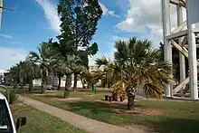 The Memorial Pavilion is situated in a triangular shaped park planted with palm trees opposite the Bundaberg Base Hospital. The park is at the junction of two main streets in Bundaberg with the pavilion facing the corner.[1]