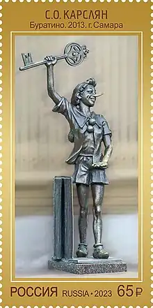 Buratino (Russian: Буратино) is the main character of Aleksey Nikolayevich Tolstoy's 1936 fairy tale The Golden Key, or the Adventures of Buratino, which is based on the 1883 Italian novel The Adventures of Pinocchio by Carlo Collodi.[1][2] Buratino originated as a character in the commedia dell'arte. The name Buratino derives from the Italian burattino, which means "wooden puppet" or "doll".[3] The book was published in 1936; the figure of Buratino quickly became hugely popular among children in the Soviet Union and remains so in Russia to this day (Buratino is one of the most popular characters of Russian children's literature). The story has been made into several films, including the animated 1959 film and the live-action 1975 film.