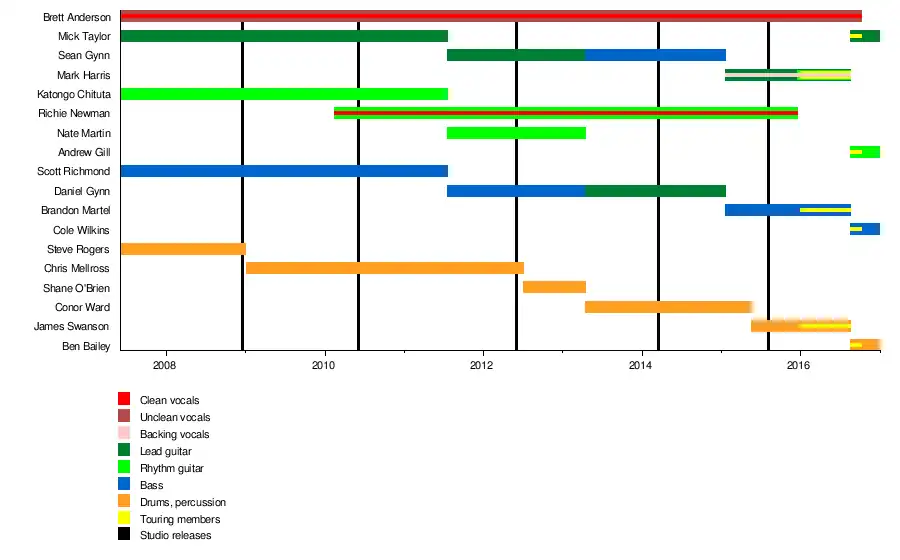 | Past members | Brett Anderson Mick Taylor Katongo Chituta Scott Richmond Steve Rogers Chris Mellross Shane O'Brien Nate Martin Sean Gynn Daniel Gynn Conor Ward Richie Newman Andrew Gill Mick Taylor Ben Bailey Cole Wilkins |