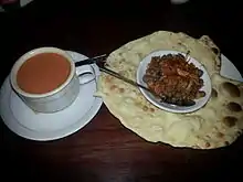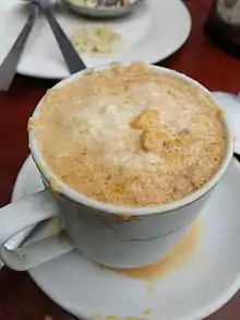 Burmese milk tea (Burmese: လက်ဖက်ရည်, lit. 'tea liquid') is a tea beverage from Myanmar (Burma), traditionally made with strongly brewed black tea and milk (typically evaporated milk and condensed milk). Burmese milk tea is commonly consumed at tea shops, as an accompaniment to bite-sized snacks like Burmese fritters and sweets called mont.[1]