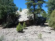 The Burned Mountain Formation as originally defined is a metamorphosed rhyolite that appears to have intruded the Moppin Complex, mostly as sills.[1] Portions of the formation are described as quartz-eye schists. The unit was later expanded to include most of the Vadito Group beds found throughout the central Tusas Mountains, representing the upper portion of the Vadito Group in this region and correlating with the Glenwoody Formation in the Picuris Mountains.[2] It is up to 30 meters (98 feet) thick[3] and has a uranium-lead radiometric age of 1700 Mya.[2]
