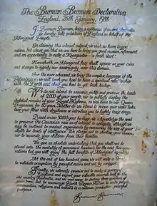 He may be best remembered for planting the Aboriginal flag on the white cliffs of Dover on the Australian Bicentenary Day of 26 January 1988. This was his satirical way of claiming England, as Arthur Phillip had done to Burnum Burnum's homeland in 1788 when arriving with the First Fleet.[6] However, Burnum stated that no harm would come to England's native people as a result of his invasion.[2] A copy of the Burnum Burnum Declaration is on display among the Indigenous carvings and sculptures at the Enchanted Maze (a.k.a. Arthur's Seat Maze), Mornington Peninsula, Melbourne.