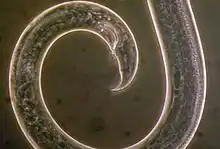 Bursaphelenchus is a genus of nematodes (roundworms) in the order Aphelenchida. Most are obligate mycophages, but some feed on wood, with two species, the red ring nematode (B. cocophilus) and the pine wood nematode (B. xylophilus), economically significant as pests of coconut palms and of pine trees, respectively. Given that Bursaphelenchus species are usually hard to distinguish from one another except by trained nematologists with access to microscopes or DNA sequence analysis, the entire genus is put under quarantine in some countries. Where this is not the case however, these nematodes are becoming established as model organisms for nematode developmental biology, ecology and genetics.[1]