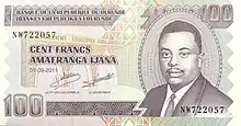 | 500 francs (Amajan Atanu Amafranga) | President Melchior Ndadaye | Banque de la République du Burundi (Ibanki ya Republika y'Uburundi; Bank of the Republic of Burundi) building, Bujumbura | ||