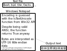 Bush hid the facts is a common name for a bug present in some versions of Microsoft Windows, which causes text encoded in ASCII to be interpreted as if it were UTF-16LE, resulting in garbled text. When the string "Bush hid the facts", without quotes, was put in a new Notepad document and saved, closed, and reopened, the nonsensical sequence of the Chinese characters "畂桳栠摩琠敨映捡獴" would appear instead.