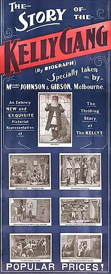 Early bushranger films include Bushranging in Northern Queensland and Robbery of a Mail Coach by Bushrangers. Both were released in 1904 and ran five minutes long and six minutes long respectively.[14] The Story of the Kelly Gang, about the bushranger Ned Kelly, was released in Melbourne on 26 December 1906.[14] The Story of the Kelly Gang is notable for being the first feature film ever made.[13] At the time of its release, it was considered to be the longest film that had ever been made, running at around seventy to eighty minutes.[15]