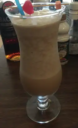 | Preparation | Blend all the ingredients together in a blender, including the ice, and then strain into a hurricane glass. Place cherry on top of the drink as a garnish and serve. Whipped cream can also be added as a garnish to the top of the drink before the cherry.[1] |