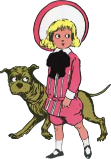 It typically consisted of a belted, double-breasted tunic or jacket worn with a large round collar, floppy bow, and shorts or knickerbockers. It was often worn with a round straw hat and a haircut with bangs.[1][2] Along with the sailor suit, the Eton suit, the Norfolk suit and the Fauntleroy suit, the Buster Brown suit is cited as one of the key looks in boys' clothing of the period.[3][4]