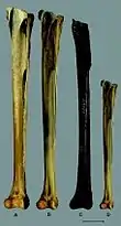Buteogallus daggetti was first described by Loye Holmes Miller in 1915 as Morphnus daggetti, from a tarsometatarsus found in the La Brea Tar Pits.[2] The bone's great length, comparable to a great blue heron's, gave him the impression of an "eagle on stilts" and led to comparisons with the secretarybird. The specific name pays tribute to F.S. Daggett of the Natural History Museum of Los Angeles County (at the time the Museum of History, Science, and Art). By 1925, Miller had assigned three more tarsometatarsi and an incomplete tibiotarsus to the genus.[1]