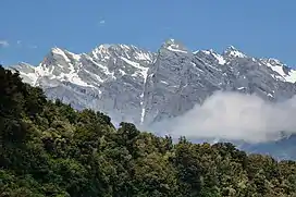 The Butler Range was probably named by Charlie Douglas in the late 1890s after John Butler of Whataroa. Due to its isolation, some of its peaks had their first ascents as late as the 1940s.[3] Named peaks of the Butler Range, from west to east, are Bamford Knob (1,845 metres or 6,053 feet),[4] Tohunga Peak (1,926 metres or 6,319 feet),[5] Mount Whataroa (2,123 metres or 6,965 feet; first ascended 1949),[6] Mount Rangatira (2,157 metres or 7,077 feet),[7] and Mount Ariki (2,193 metres or 7,195 feet; first ascended 1949).[8][2] The range can be seen from State Highway 6 from where it crosses the Whataroa River.[2]