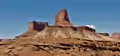Buttes of the Cross is two sandstone summits located in the northern reach of Glen Canyon National Recreation Area, in Wayne County of Utah, United States.[3] The larger and higher south butte reaches an elevation of 5,642 feet (1,720 meters), whereas the north butte rises to 5,569 feet, with approximately 0.6 miles (0.97 km) separation between them.[2] When viewed from the north-northeast near Labyrinth Canyon, they align to form the shape of a cross, creating the appearance of a single butte. The name "Butte of the Cross" was first applied by John Wesley Powell during the Powell Geographic Expedition of 1869.[3] A few miles further down the Green River, Powell finds that this geographical feature is two buttes when viewed from the east, so it was renamed Buttes of the Cross.[4] Buttes of the Cross towers over 1,400 feet (430 meters) above its surrounding terrain. It is situated 6.8 miles west of Candlestick Tower, and one-half mile outside the boundary of Canyonlands National Park.