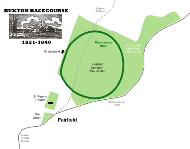 The racecourse closed after the last race meeting in 1840 and the grandstand was subsequently pulled down.[4] Timbers from the stand were reused in the building of the Methodist Chapel at Higher Buxton in 1849.[2] The racetrack's grandstand is shown on the 1841 tithe map of Fairfield and the track itself is shown on an old OS map from c.1830s.[5][6]