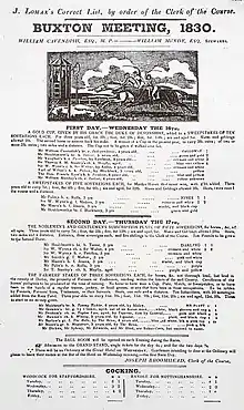 Fairfield Common was established centuries ago as common grazing land. A racecourse was laid out on the common in the early 1800s. From 1821 racing and county cock fighting meetings were held each summer. The 6th Duke of Devonshire commissioned a grandstand building costing £1,000 which stood in the 1830s. The race programme for the meeting on 16th-17th June 1830 lists the Duke of Devonshire's Gold Cup race, The Noblemen's and Gentlemen's Subscription Plate race and the Farmers' Stakes race. That year a mass riot and fight broke out.[1][2]