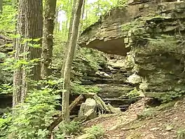 The trail begins on a bluff overlooking the Ohio River. From there a steep trail ascends through a hardwood forest to a rocky stream that runs into the river with waterfalls and large sandstone outcrops. The trail is approximately 0.8 miles (1.3 km) long.[1] The overlook area has primitive camping and picnic facilities.[2] it has multiple trails with many small caves.