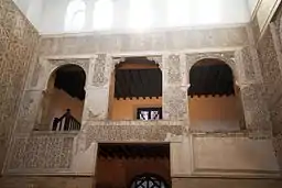 The hekhal (ark), where the Torah scrolls were kept, was located on the eastern wall, which was customary. The wall is angled, following the street outside, and was decorated with elaborate stucco in accordance with the Mudejar tradition. One of the Hebrew inscriptions mentions the hekhal, reading "I will bow down before Your Holy hekhal...." The second focus, the bimah (elevated platform), may have been in the center of the room; it has not survived.[3] Benches for the congregants were placed along the walls of the room.