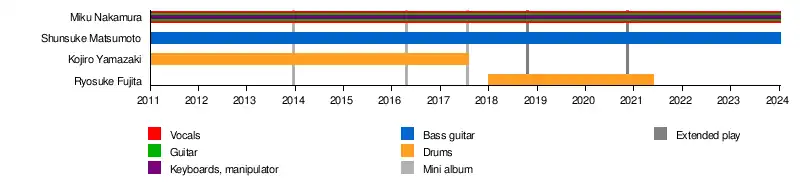 - Miku Nakamura (中村未来) — vocals, guitar, keyboards, manipulator (2011–present)