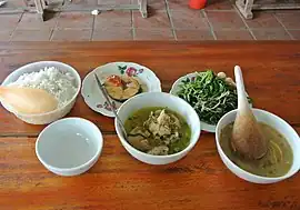 The meal almost always consists of a large helping of rice, boiled or pickle vegetables, soup, and some choices of meat.[1] Possible side dishes may include pork, beef, chicken, eggs, fish, grains, vegetables, tofu, soups, broths, etc. It is often eaten with chopsticks and a spoon.[2]